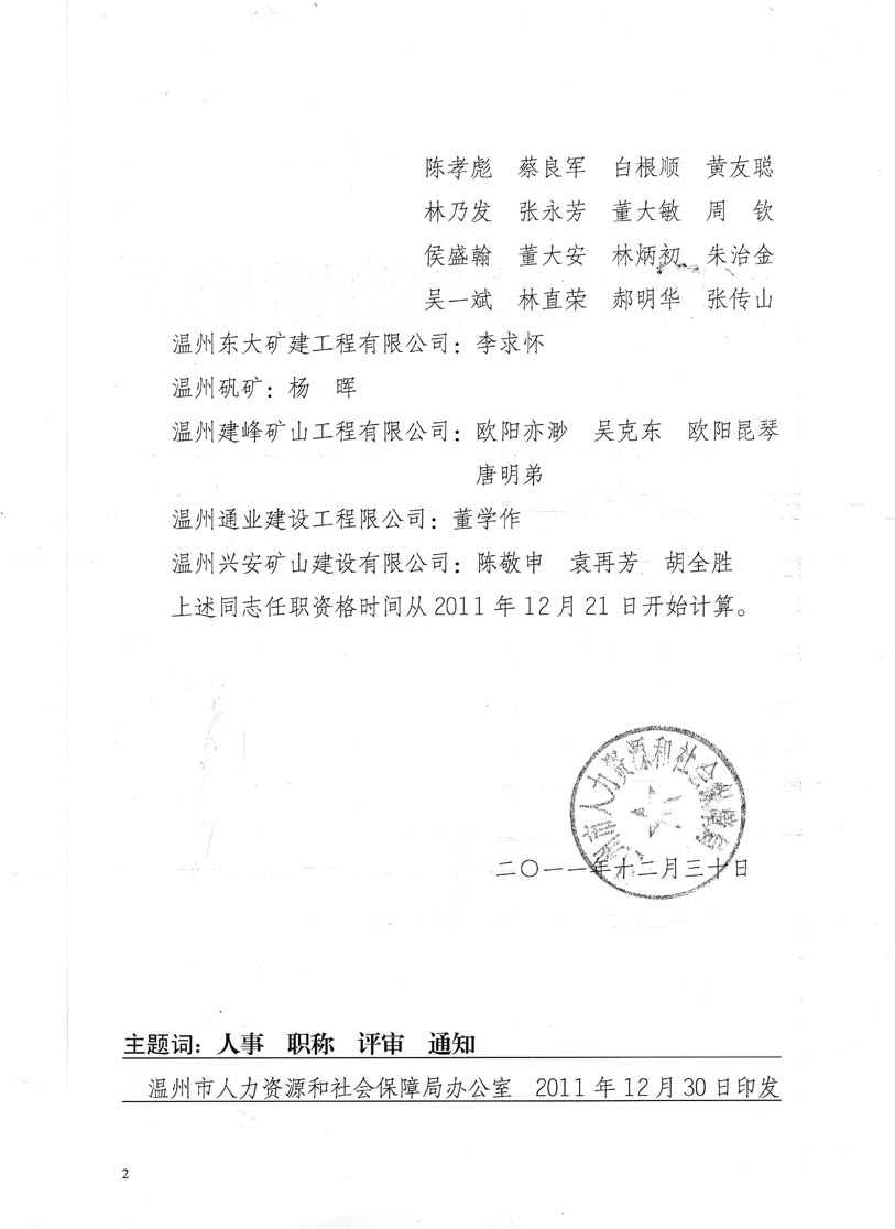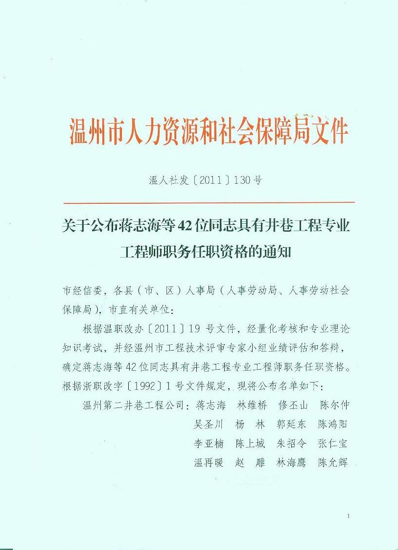 關(guān)于公布蔣志海等42位同志具有井巷工程專(zhuān)業(yè)工程師職務(wù)任職資格的通知